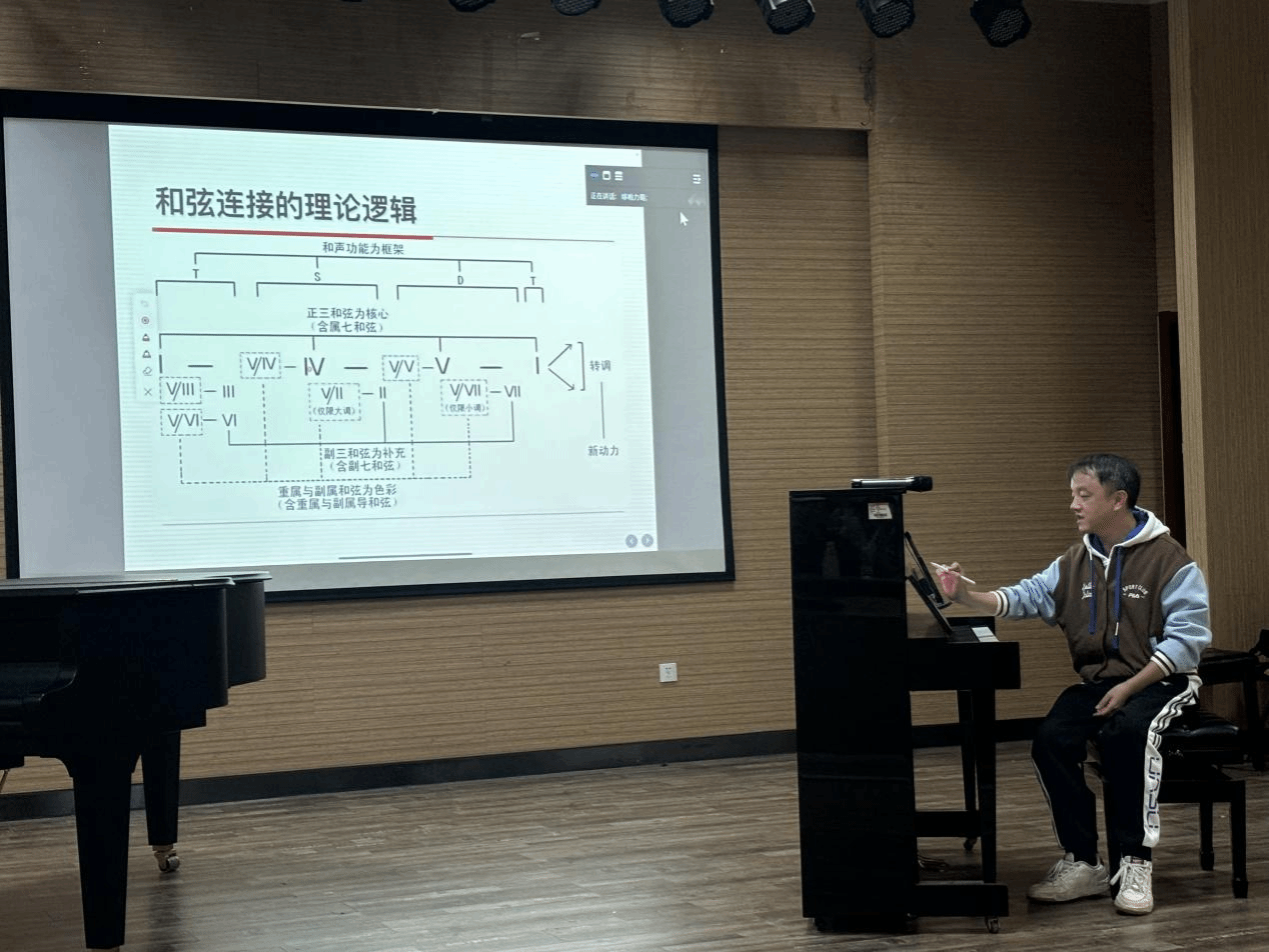 在《多声部音乐的和弦编配与运用》公开课上,张力引领到场学生深入探寻多声部音乐的奥秘。他借助生动的案例以及精彩的示范,细致讲解了和弦编配的基本原则与应用方法。他着重强调了和弦在多声部音乐编配中的重要地位,以及怎样依据不同的音乐风格和情感表达进行合理的和弦选择。此外,张力还亲自示范和弦连接的不同方式,并现场指导学生进行和弦编配的实践操作。同学们积极参与,现场气氛十分热烈。