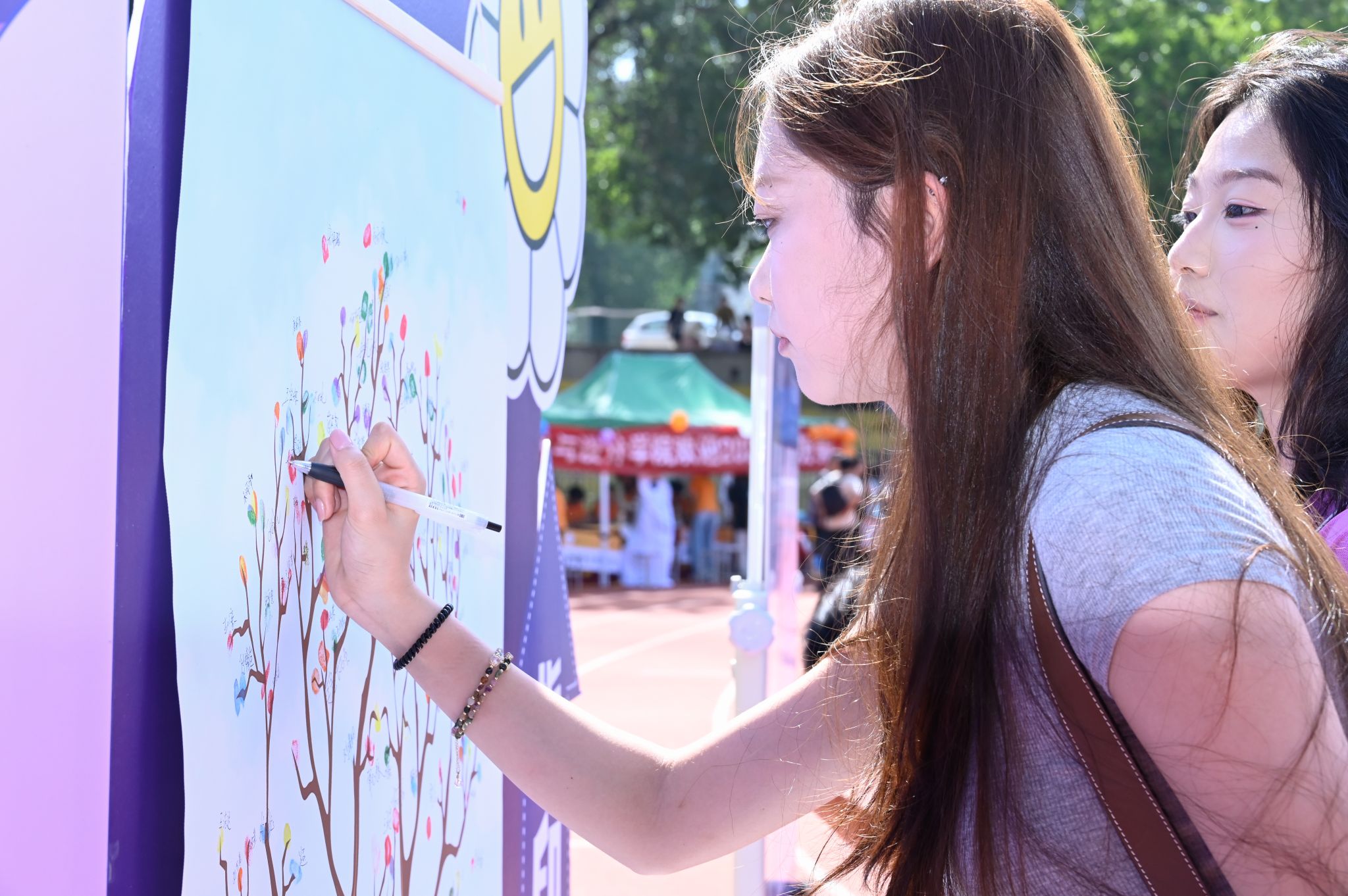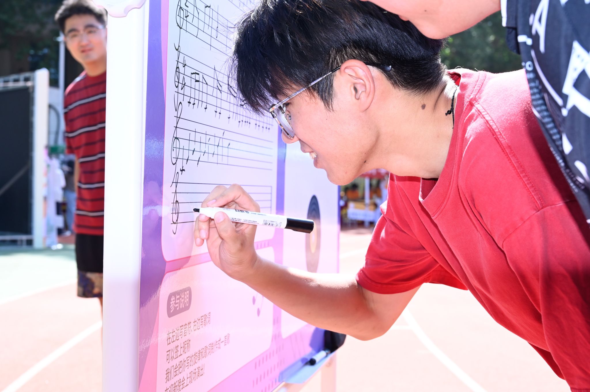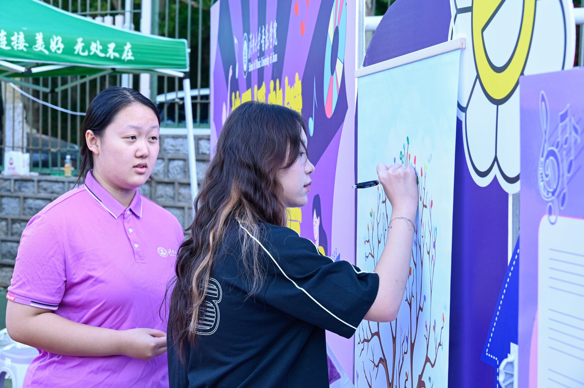 迎新日特别企划!学院打造“指印·时光交响树”互动艺术装置,志愿者们热情引导,新生用彩色手印点缀枝丫,并写下第一段大学乐谱,共同创作属于2025级的音乐之树。