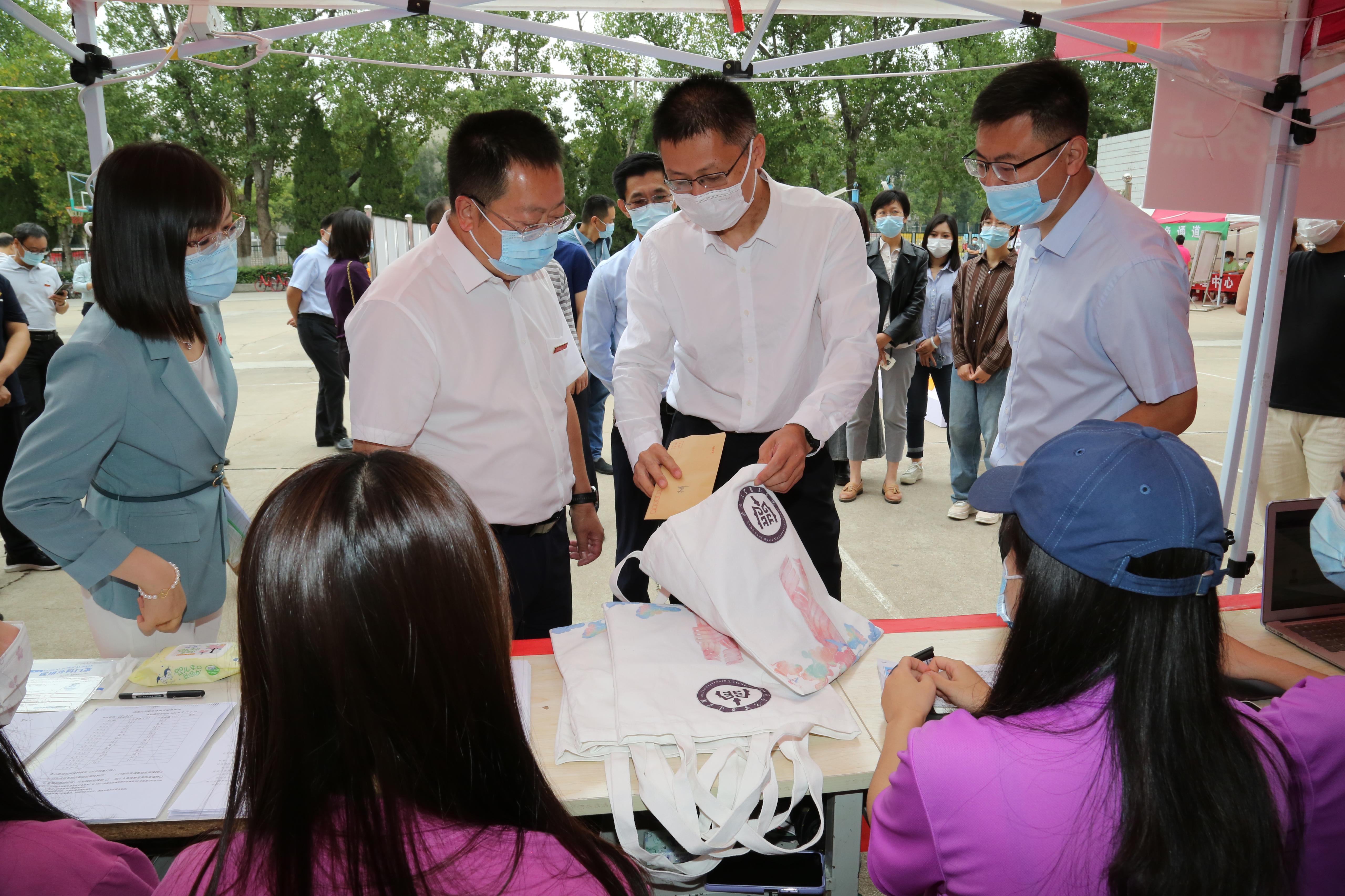 校长刘宗明一行来到迎新现场,看望入校新生并慰问学生工作人员及志愿者。学院各项迎新工作严格按照上级和学校防疫要求,明确规范标准,确保工作有序开展。
