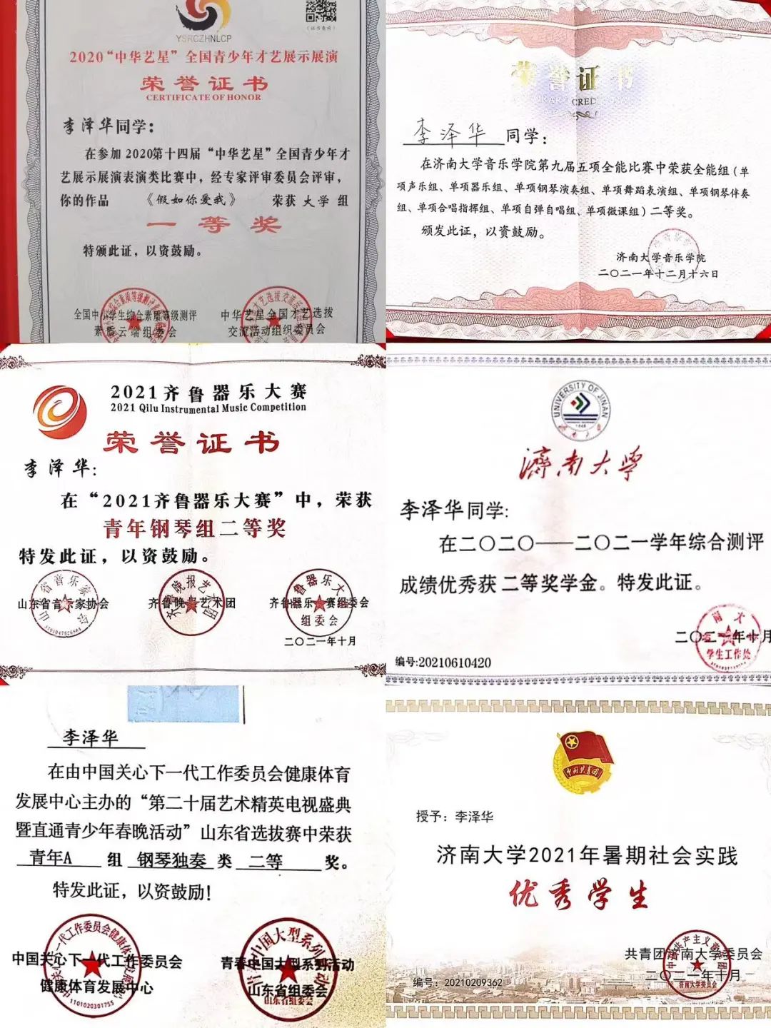 院级五项全能比赛全能组二等奖、第二十届艺术精英电视盛典活动钢琴独奏类二等奖