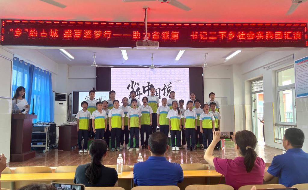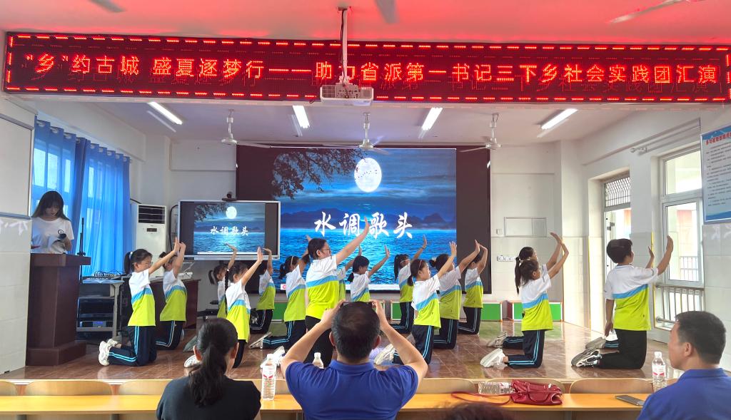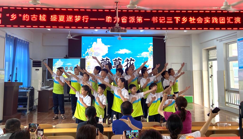 青春,两个跳动的音符,奏出最动人的音乐;青春, 两个炽热的字眼 ,谱写出最振奋人心的篇章;青春,两种绚丽的色彩,打造出最灿烂多彩的童年。活动结束后,举办了以“‘乡’约古城镇,盛夏逐梦行”为主题的汇报演出,孩子们以饱满的热情和积极向上的精神面貌向大家展示了《少年中国说》、《水调歌头》、《有你就幸福》、《萱草花》等节目,最后实践团集体演唱的由古城镇第一书记工作组协助创作的《古城镇镇歌》将演出推向了高潮,此次文艺汇演的举办,给予孩子们一个真正张扬自我个性和勇气的舞台。也充分展示省派第一书记优势,与被帮扶学校一起,共同打造多方联动、富有活力的中小学美育新格局,为推动地方基础教育高质量发展作出积极贡献。