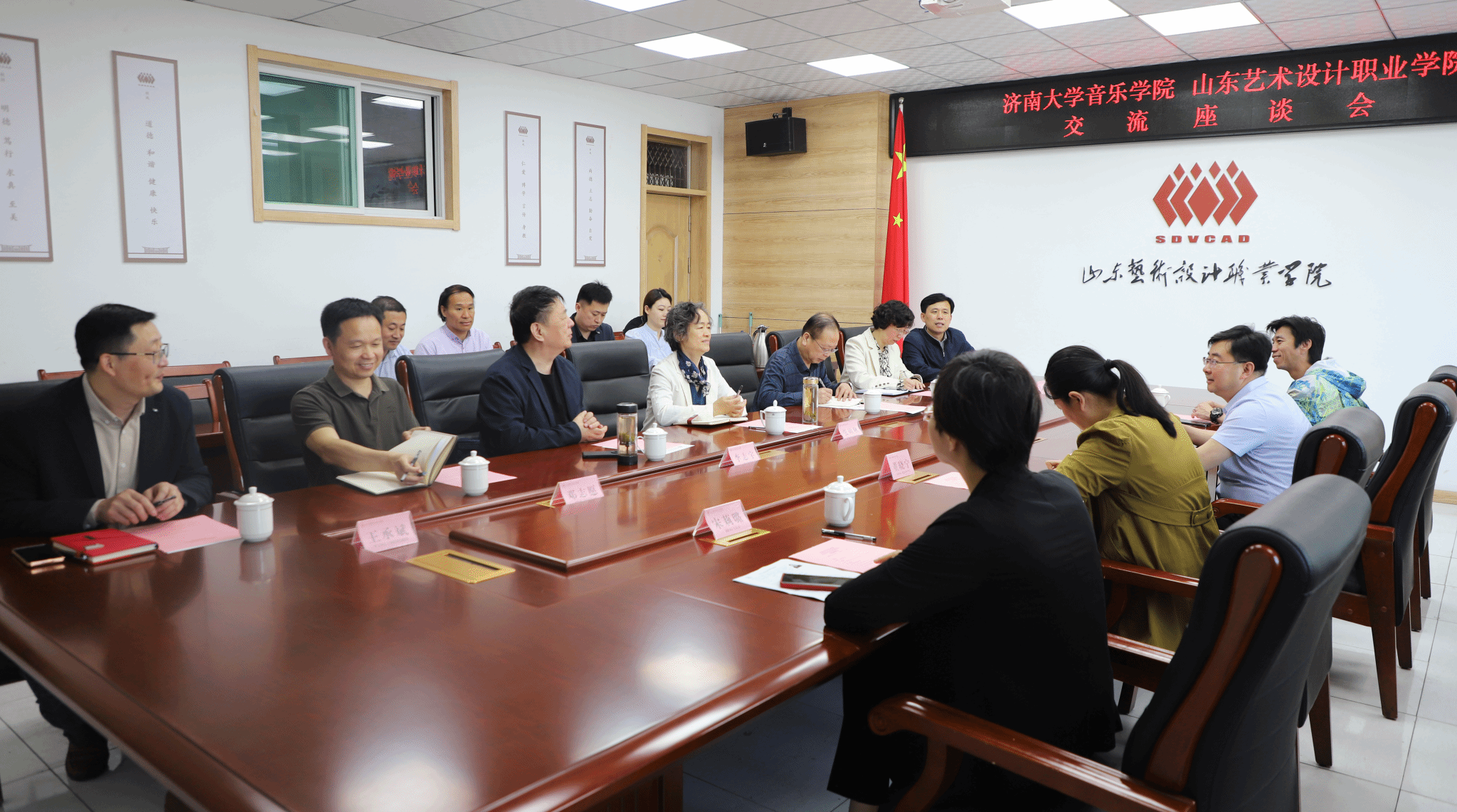 党委书记孙翔玲,党委副书记、副院长董晓宁,舞蹈系主任王海潮,毕业生辅导员宋莉璐一行4人赴山东艺术设计职业学院交流座谈。山东艺术设计职业学院党委书记张硕秋、常务副校长张维浩、党委常务副书记李志宇、副校长孙立明以及相关部门和学院的负责同志参加活动。