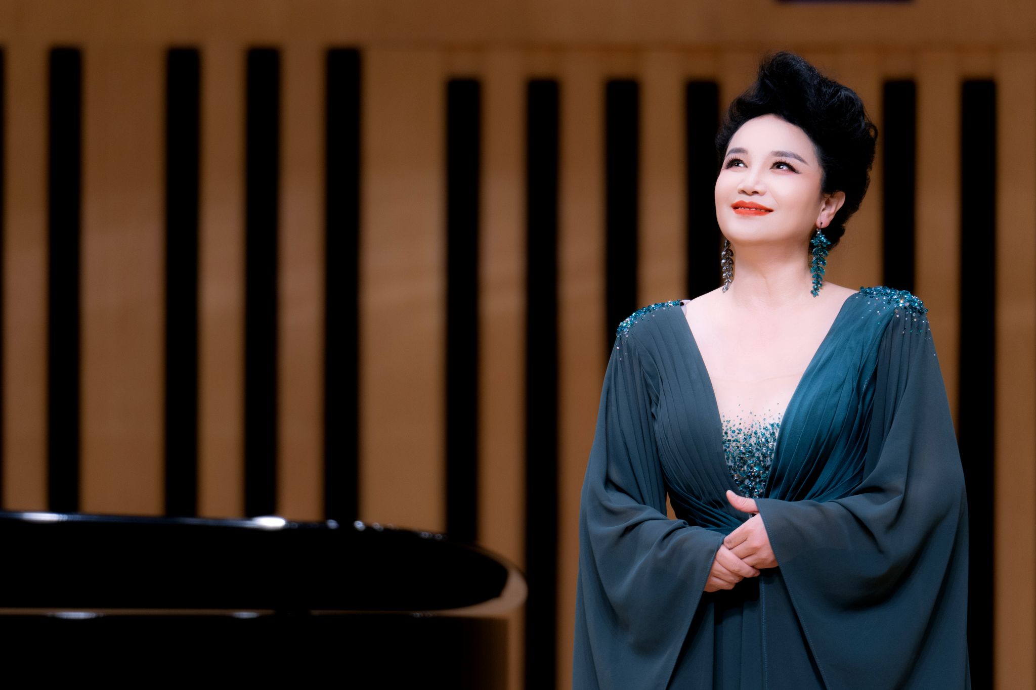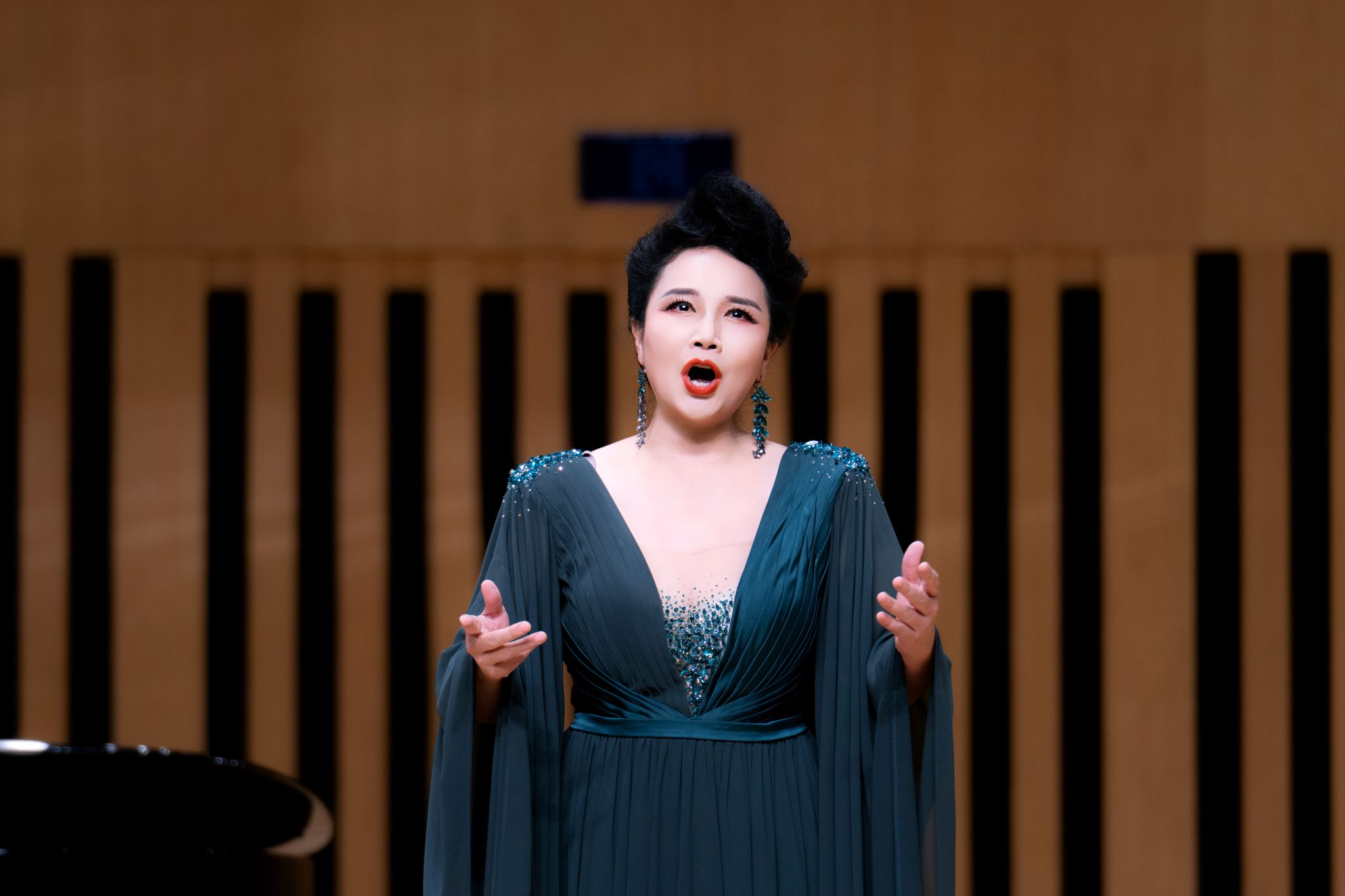 音乐会伊始,外国艺术歌曲的演绎中,克里斯托弗·威利巴尔德·格鲁克的《我怀着满腔热情》在杨瑞深情饱满的演唱中响起,瞬间点燃了全场气氛,引领观众步入音乐的魅力殿堂。紧随其后的安东尼奥·切斯蒂的《围绕着我崇拜的人儿》,则将观众带入歌剧的浪漫之境。杨瑞凭借出色的演唱技巧和细腻的情感表达,生动诠释了歌曲中的真挚情感,展现出其扎实的声乐功底和对音乐的深刻领悟。弗朗茨·舒伯特的《甘尼美》和《幸福》在她的诠释下细腻入微,仿佛引领观众走进了舒伯特的音乐天地,感受其中的温暖与美好。