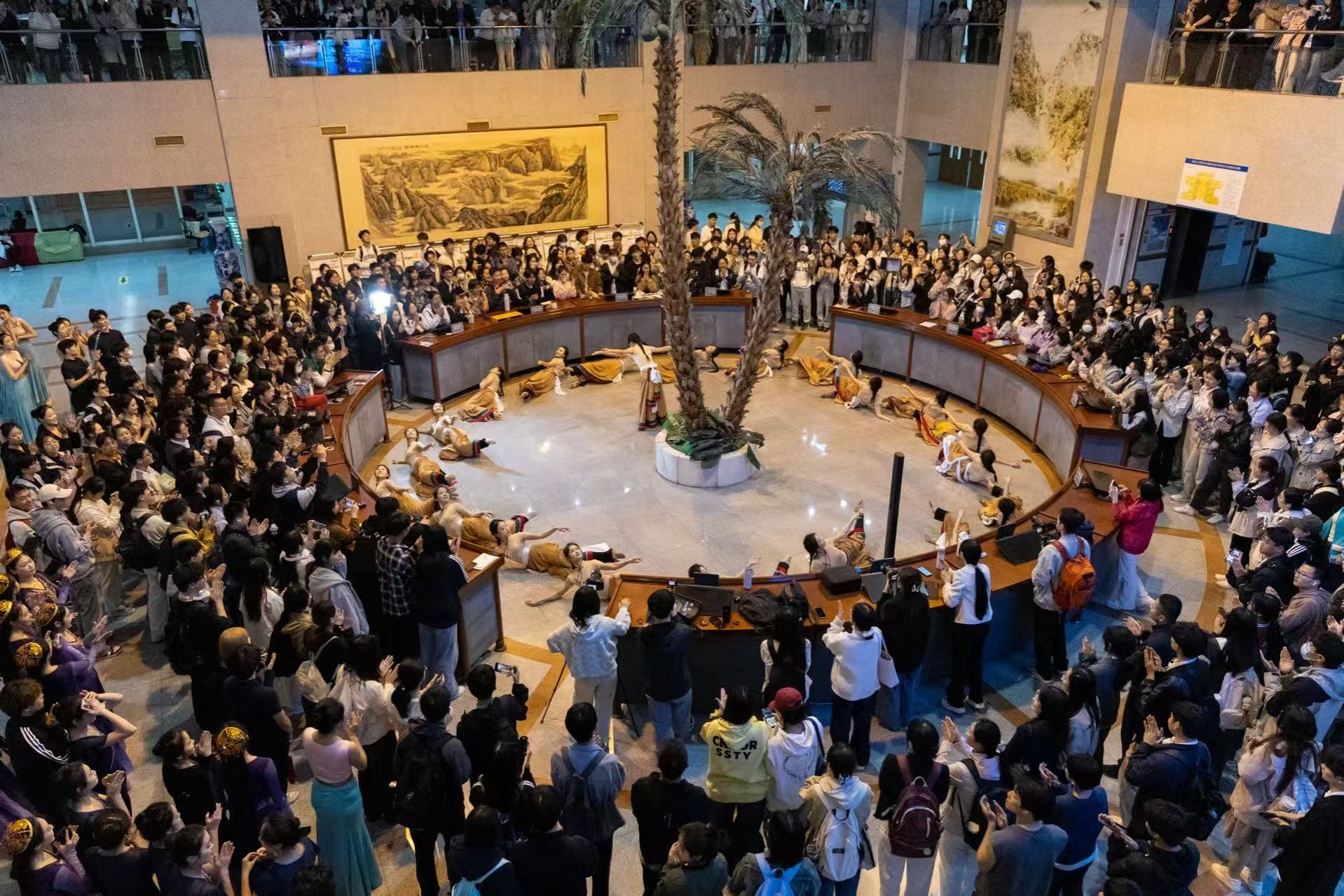 参与这次美育实践,宛如开启了一场穿越时空、邂逅多元魅力的奇幻之旅。排练时我们为一个眼神一个动作反复雕琢,汗水湿透衣衫却乐此不疲;音乐奏响我们完全沉浸其中,舞步与心跳同频,仿佛化身文化传播的使者,这不仅是一场表演,更是民族精神和传统文化的传递。