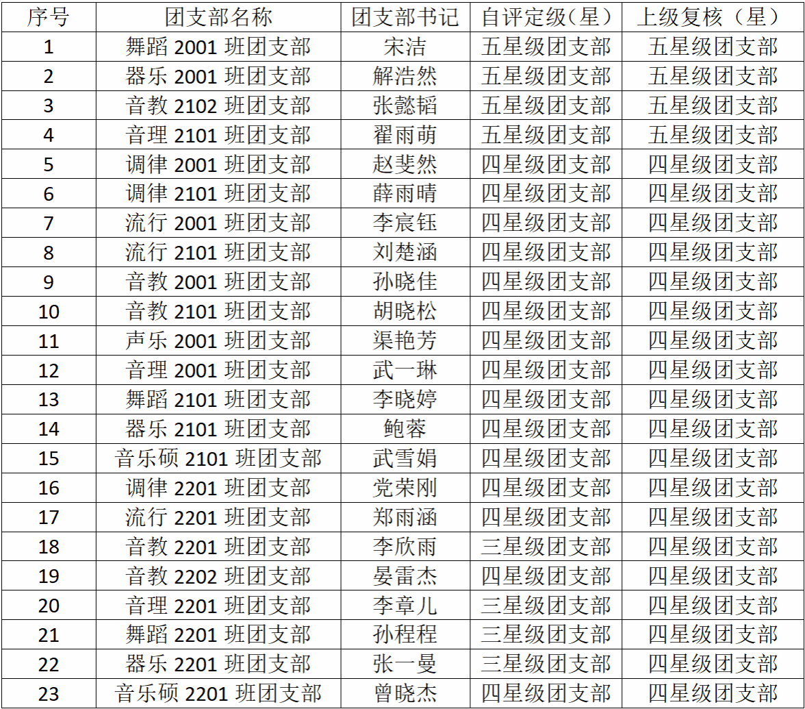 经团支部对标自评、自评材料审核及学院团委复核认定,欧美a片 2023年度团支部“对标定级”评定结果如下,现予以公示。