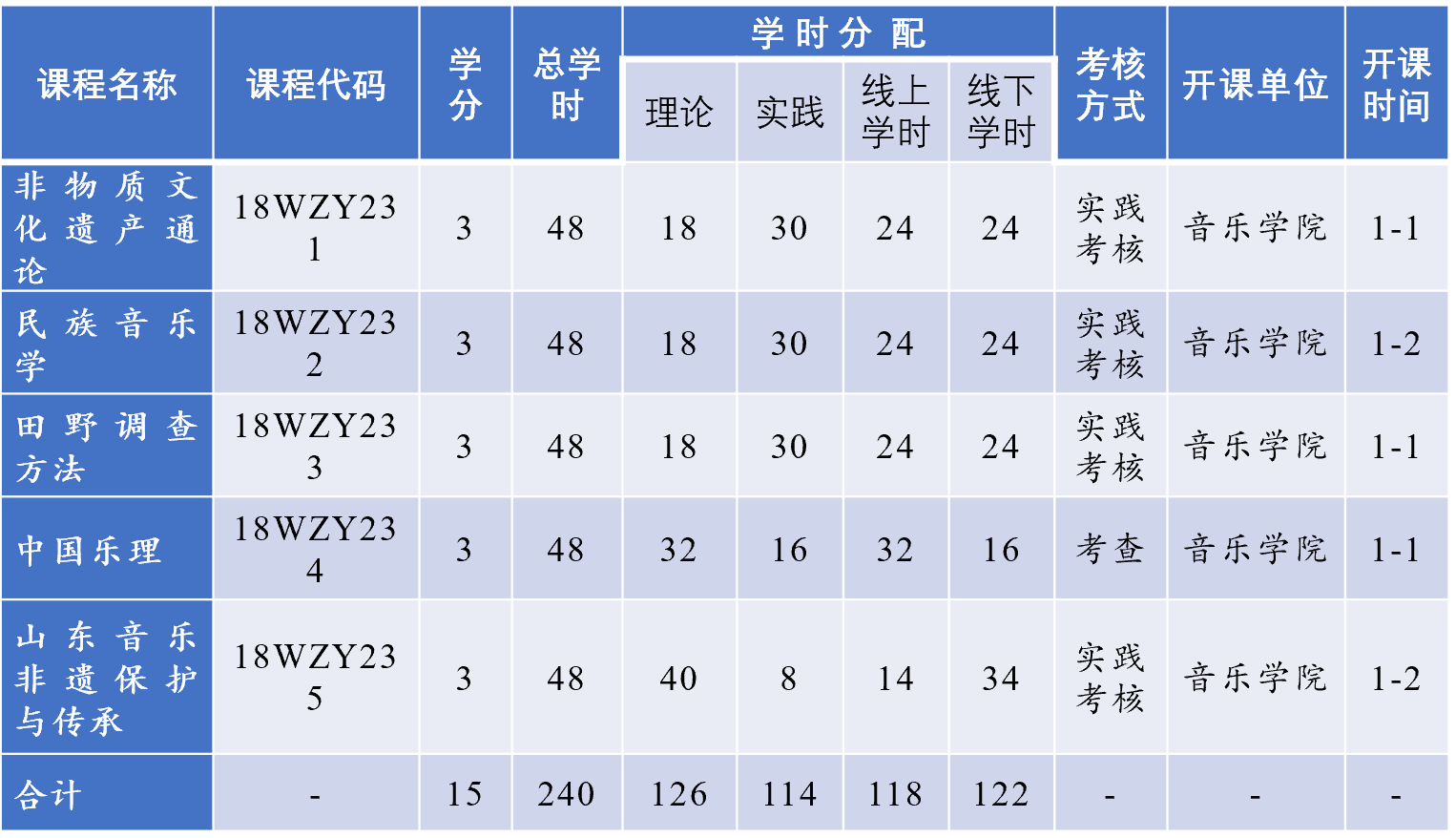 “音乐非遗学”微专业由5门课程组成,每门课程3学分,共计15学分