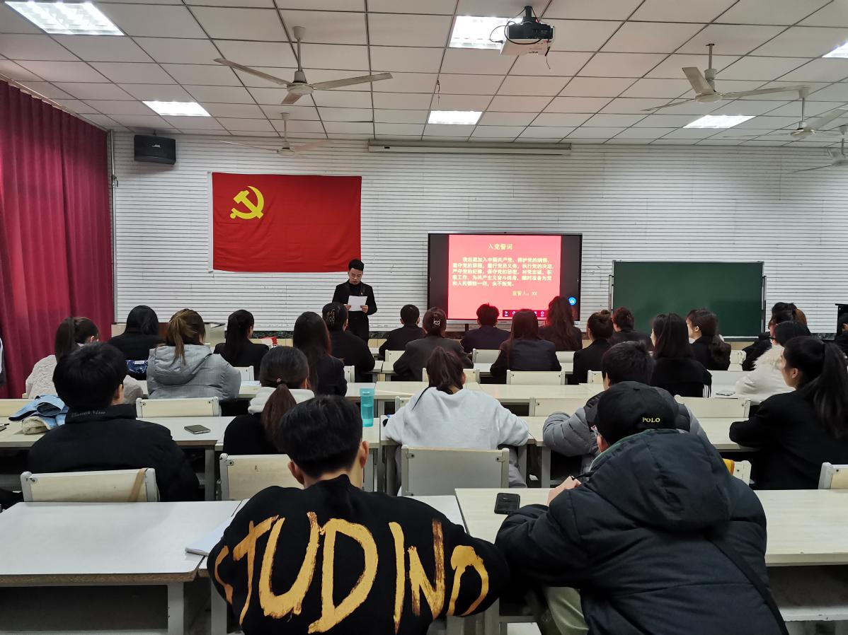 在第二多媒体教室举行新发展预备党员入党宣誓仪式,学院新发展的预备党员师生29人参加宣誓,仪式由学生第一党支部书记马媛主持。