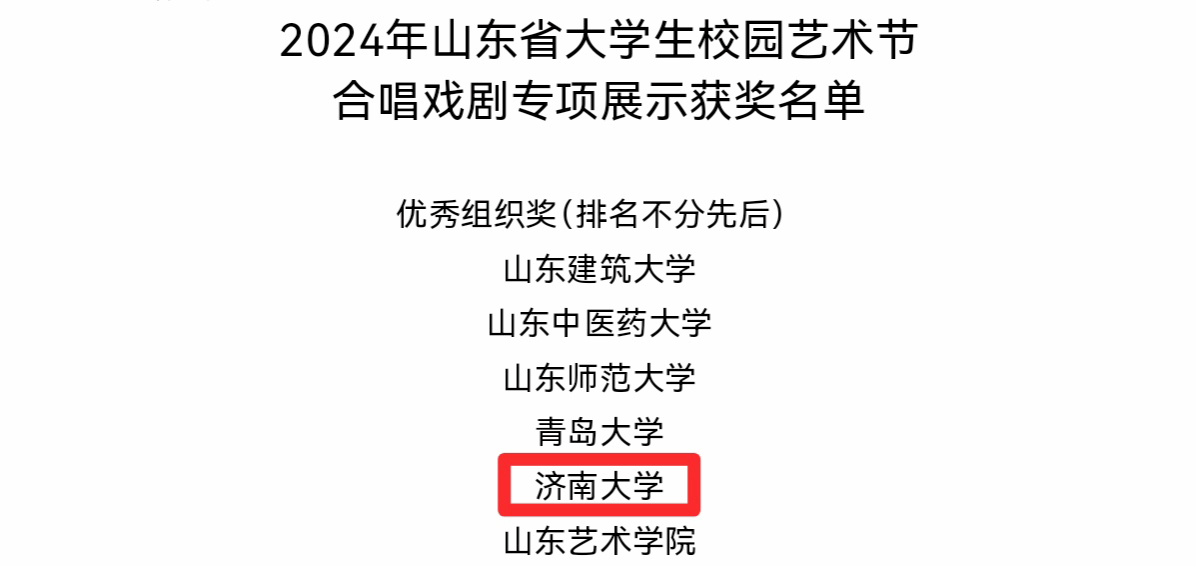 近日,山东省教育厅发布《2024年山东省大学生校园艺术节合唱戏剧专项展示活动获奖名单》,我校成绩斐然,荣获优秀组织奖、优秀指挥奖、优秀伴奏奖及表演(合唱)一等奖。